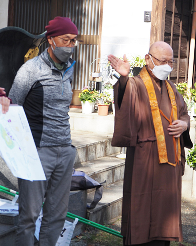 11月17日の「屋外授業」では、篠原小学校から徒歩10分ほどの場所にある、城代を務めたと伝えられる金子出雲(いずも)の菩提寺・長福寺(篠原町)をまずは訪問。