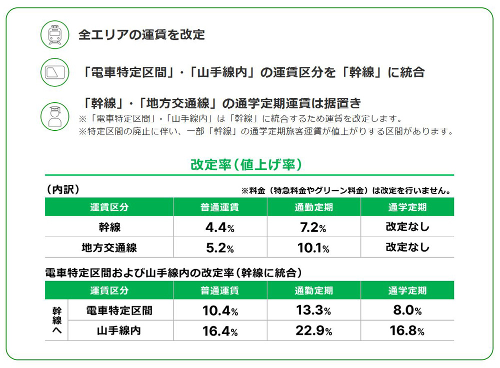 これによると、横浜線や湘南新宿ライン、横須賀線など首都圏の「電車特定区間」(旧国電区間)と呼ばれる主要路線での値上げ率は普通運賃が10.4%、通勤定期は13.3%、通学定期が8.0%。「山手線内」では普通運賃が16.4%、通勤定期は22.9%、通学定期は16.8%を引き上げるものです。