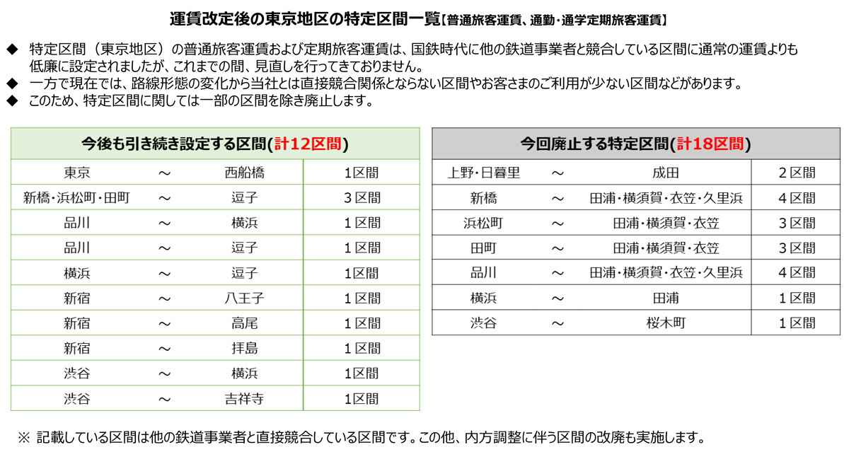 今回の改定では、私鉄と競合する首都圏の30区間に設定していた「特定区間」については一部を廃止し12区間のみを残す方針となりました。