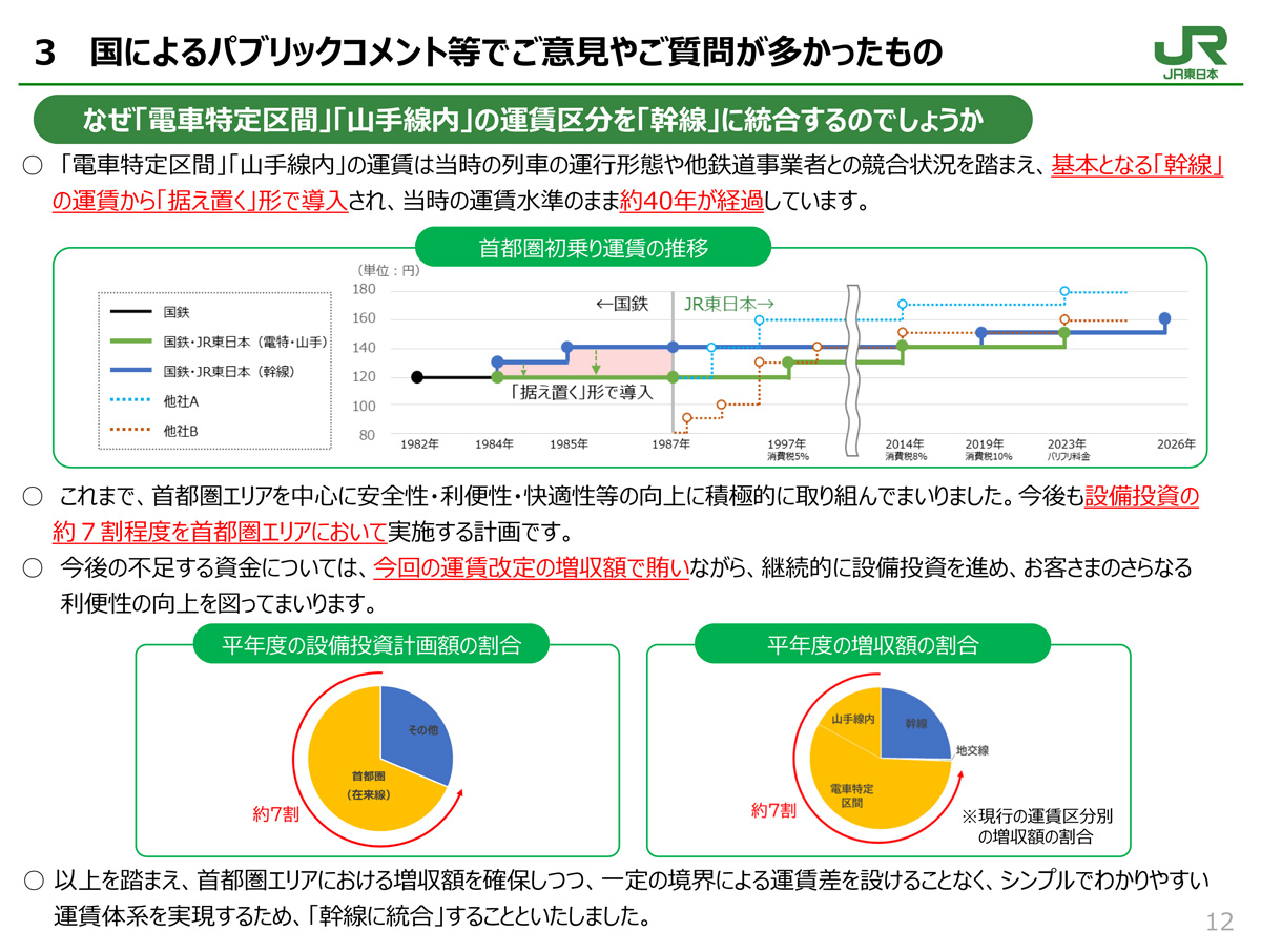 今回のような大幅な運賃改定はJR東日本の発足以来初めてのこと。鉄道利用客がコロナ禍前の水準に戻っていないことや、「進行する人口減少や少子高齢化に加え、昨今の物価高騰など、鉄道事業の収益確保が厳しさを増す」(同社喜㔟陽一代表取締役社長メッセージ)といい、「設備投資や修繕等に必要な資金を安定的に確保することが、弊社の経営努力のみでは困難な状況」(同)と理解を求めます。