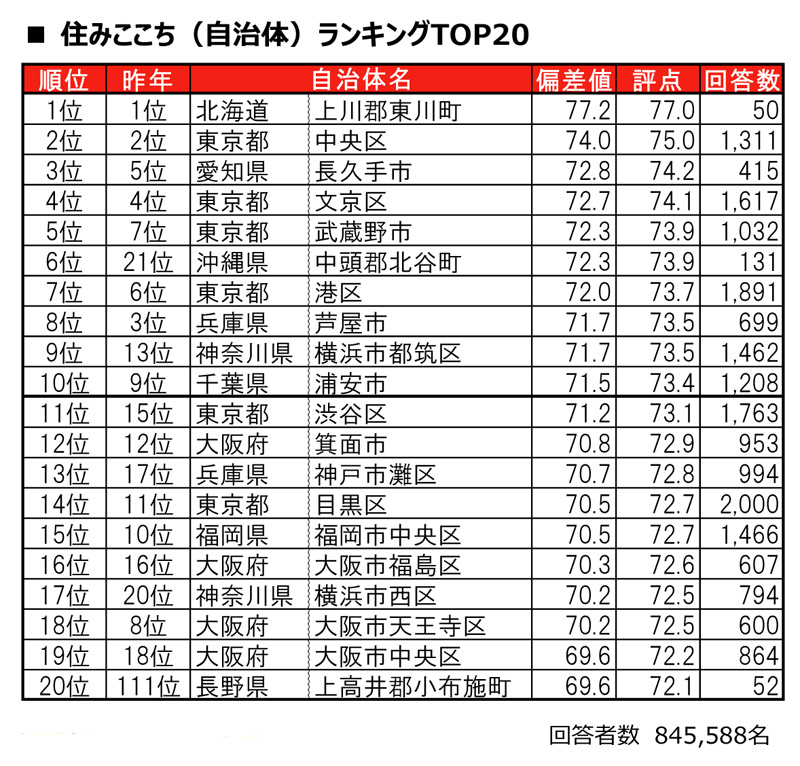 総合順位では今年も北海道の旭川市に隣接する人口8400人超の東川町がトップ。東京都中央区や愛知県長久手市などが続き、横浜市内では都筑区が前年から順位を9位まで上げ、神奈川県内唯一のベスト10入りを果たしました。