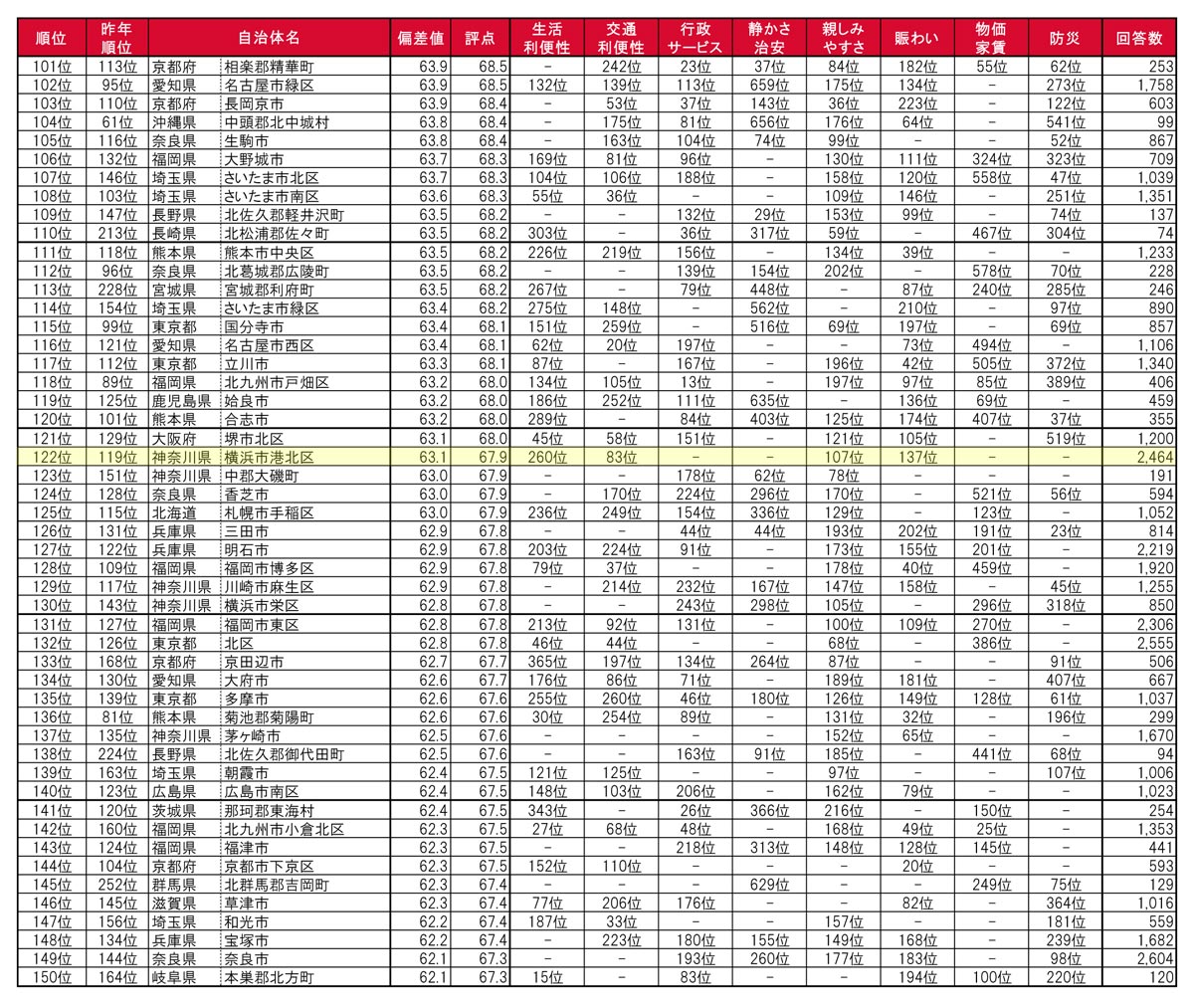 港北区は評点が前年より微増の67.9点(偏差値63.1)となりましたが、総合順位は122位(前年119位)と順位を若干下げ、評価が高かった「交通利便性」は83位(同81位)でした。