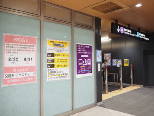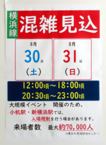 8月30日(土)・31日(日)は約7万人規模が来場し、新横浜駅では14:00~17:45、20:45~22:30の時間帯が混雑するとみており、入場制限やエスカレーターの運転を停止する可能性があると告知する(8月25日、相鉄・東急新横浜駅)