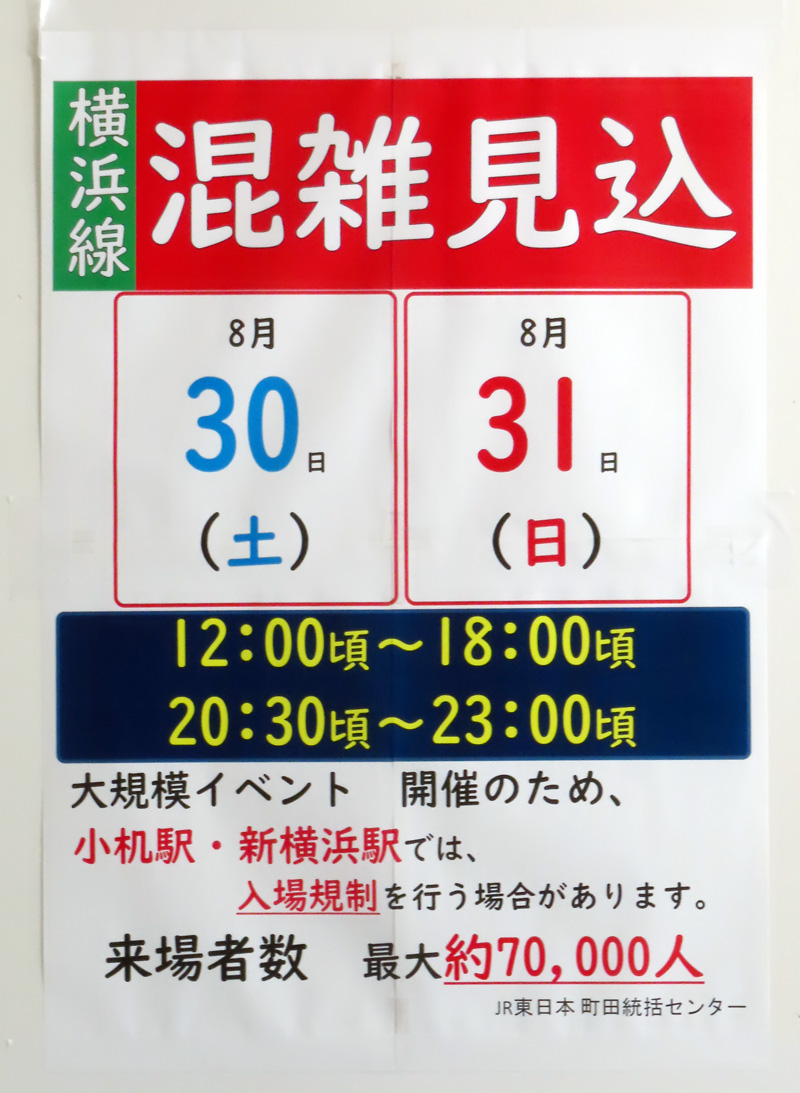 JR横浜線でも最大約7万人の来場があると見ており、新横浜駅と日産スタジアム最寄りとなる小机駅では12:00~18:00、20:30~23:00の時間帯が混雑するとみており、入場規制を行う可能性があると告知する(8月25日、JR新横浜駅)