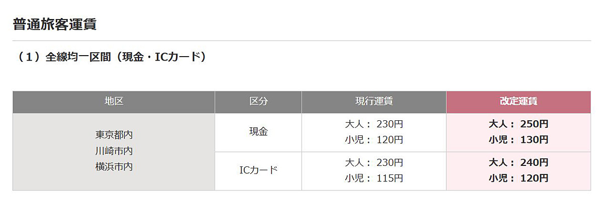 一方、実際に適用する「実施運賃」は東京都内・横浜市内・川崎市内ともに、IC運賃を240円、現金運賃を250円に設定しました。