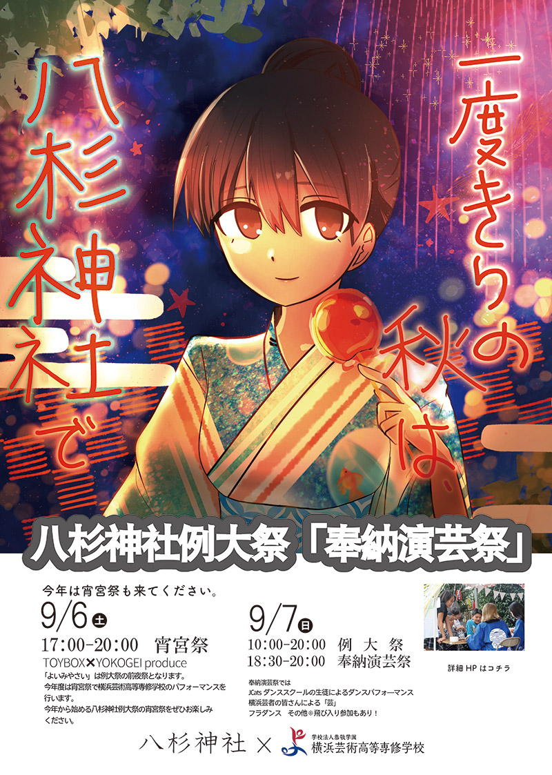 2023年から同じ大豆戸町内にある横浜芸術高等専修学校(学校法人恭敬学園)の学生がポスター制作や奉納演芸への出演などの形で祭りを盛り上げており、今年は6日(土)の宵宮で19時30分から「プロジェクションマッピング~八杉神社物語」を披露する計画です。
