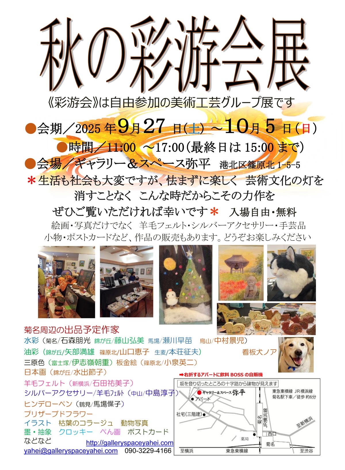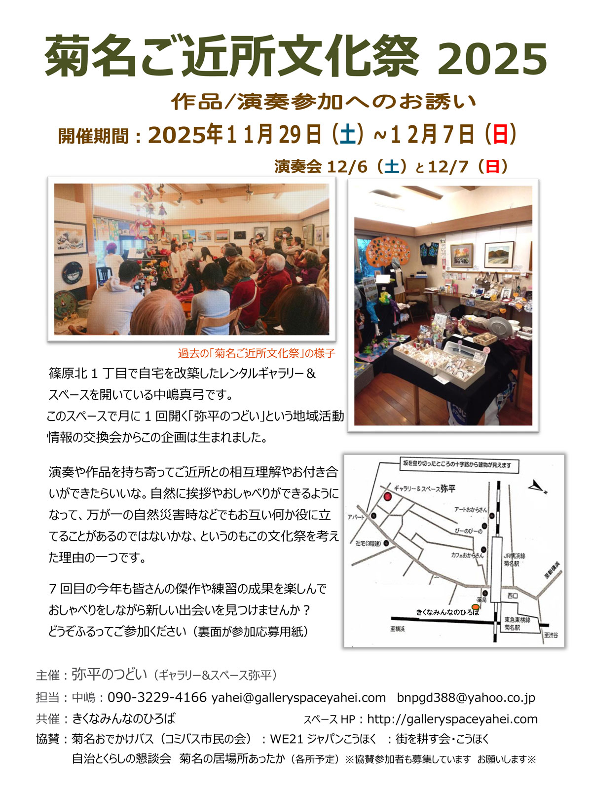 菊名駅西口に近い篠原北1丁目の「ギャラリー&スペース弥平(やへい)」では、今月(2025年)9月27日(土)から美術工芸展「秋の彩游会(さいゆうかい)展」を開くとともに、続いて11月29日(土)から12月7日(日)まで行う恒例の「菊名ご近所文化祭2025」への作品出展や演奏の参加者を募集しています。