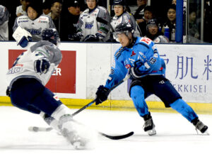 初戦は38分、この試合4度目となるPP(パワープレー)のチャンスに、今シーズンから加わったルーキーFW(フォワード)の種市悠人選手(#19、中央大学出身)が出したパスをDF(ディフェンス)のタイラー・ロックウェル選手(#22、英国リーグ出身)がシュートをゴールネットに突き刺して先制。