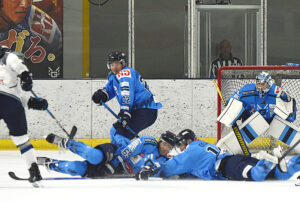 この2連戦は身体を張ったシュートブロックが目立った。写真は氷に覆いかぶさるようにシュートを阻止するDF・蓑島圭悟選手(#65)とFW・大澤勇斗選手(#14)、左奥はDF・ロックウェル選手、GK(ゴールキーパー)は冨田開選手(#31)(9月6日)