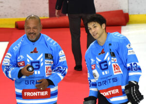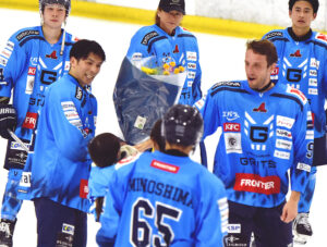 9月6日にアジアリーグ400試合出場を達成した岩本和真選手。試合前のセレモニーでは花束が届かない手違いがあり、試合後にアレックス・ラウター選手からあらためて手渡された。岩本選手は北海道苫小牧市出身でワイオミングセミナリー高校(米ペンシルベニア州)を経てニューヨーク州立大学ジェネセオ校を卒業。2013-14年シーズンからH.C.栃木日光アイスバックスで8シーズンにわたって活躍。2021-22年シーズンから横浜グリッツへ移り、過去3シーズンにわたってキャプテンをつとめ、今季はコーチを兼任している(9月6日)