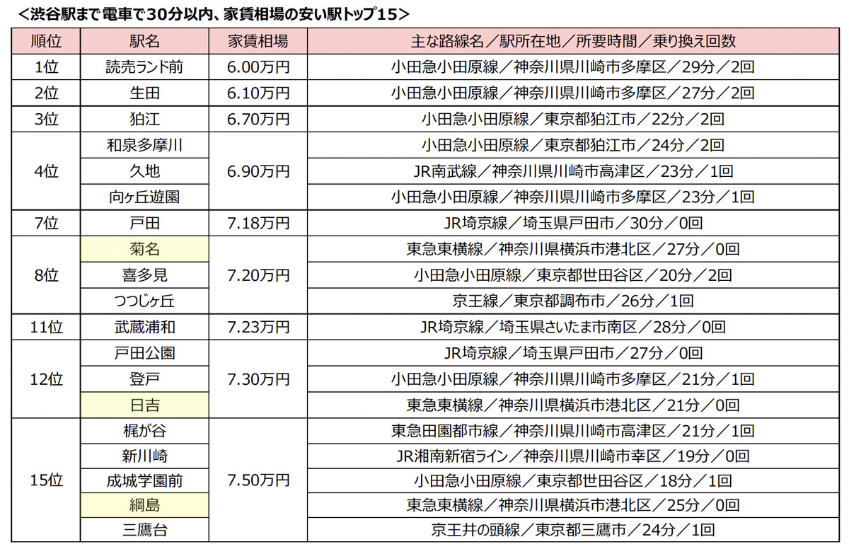 1位は前年と同様に小田急小田原線の読売ランド前駅(6.0万円、川崎市多摩区)でしたが、東横線では8位に菊名駅(7万2000円)、12位は日吉駅(7万3000円)、15位に綱島駅(7万5000円)、26位に新綱島駅(7.7万円)が入りました。