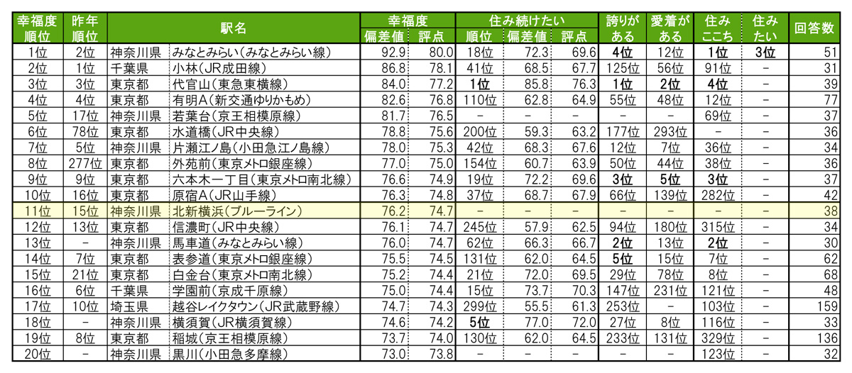 「街の幸福度」神奈川県ランキングにおける港北区内駅の順位