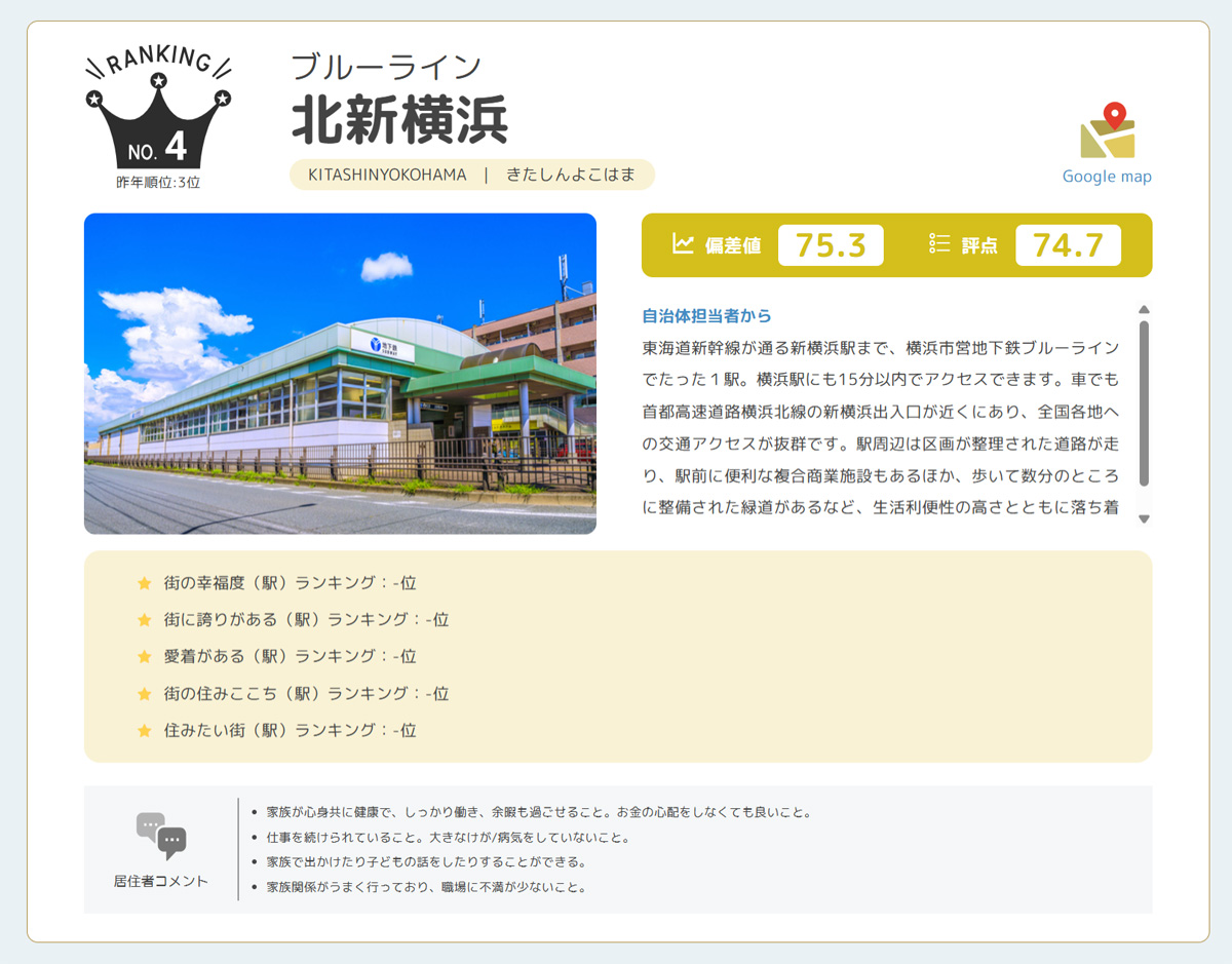 ・「街の幸福度 駅ランキング <神奈川県版>」(2025年)(北新横浜駅が県内4位、2025年9月3日発表)