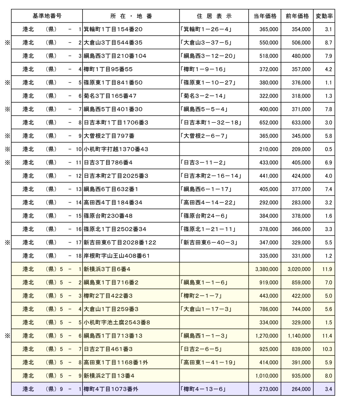 港北区内で上昇率が高かった調査地点は次の通りです。