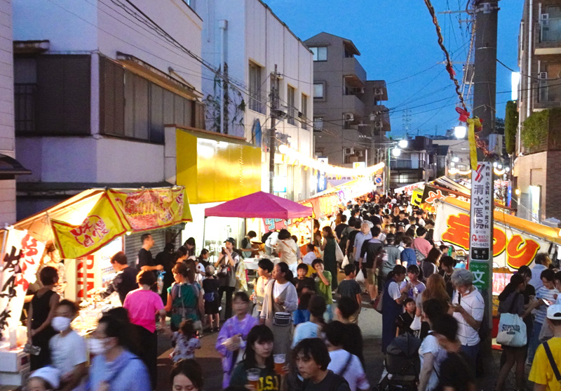 菊名神社では27日(土)の宵宮(よいみや=前夜祭)、28日(日)の本祭ともに昼過ぎから20時ごろまで旧綱島街道沿いの参道に多くの夜店が並び、27日(囃子やダンスなど)は17時30分から21時ごろまで、28日(カラオケ大会)は16時30分ごろから奉納演芸が行われます。