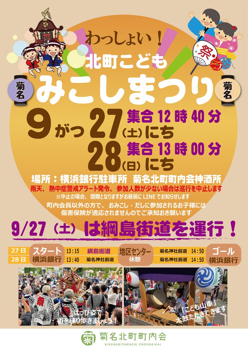 特に今年は27日の午後、旧綱島街道の横浜銀行から菊名地区センターまで綱島街道上で神輿(みこし)や山車(だし)が練り歩く予定となっています。