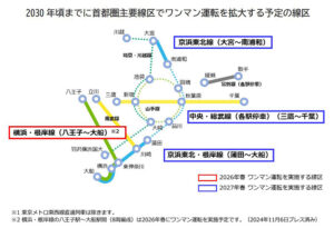 今年(2025年)春は南武線と常磐線(各駅停車)でワンマン化が行われており、来年(2026年)春は横浜線、2年後の2027年春は京浜東北・根岸線などでワンマン化が計画されている(ニュースリリースより)