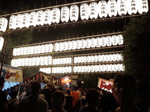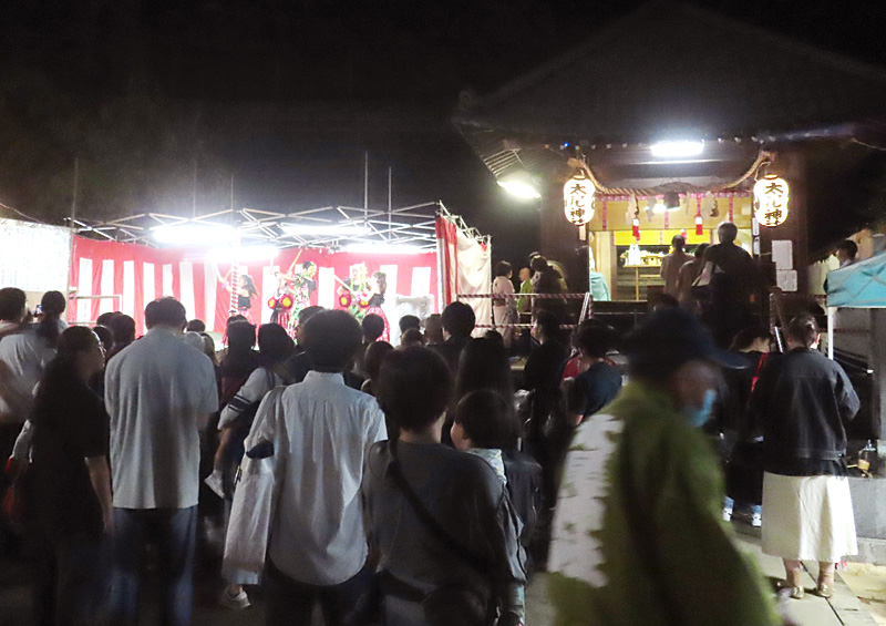 6日(月)の本祭日は提灯で彩られた参道に夜店が並び、18時ごろから「奉納演芸」が予定されています。