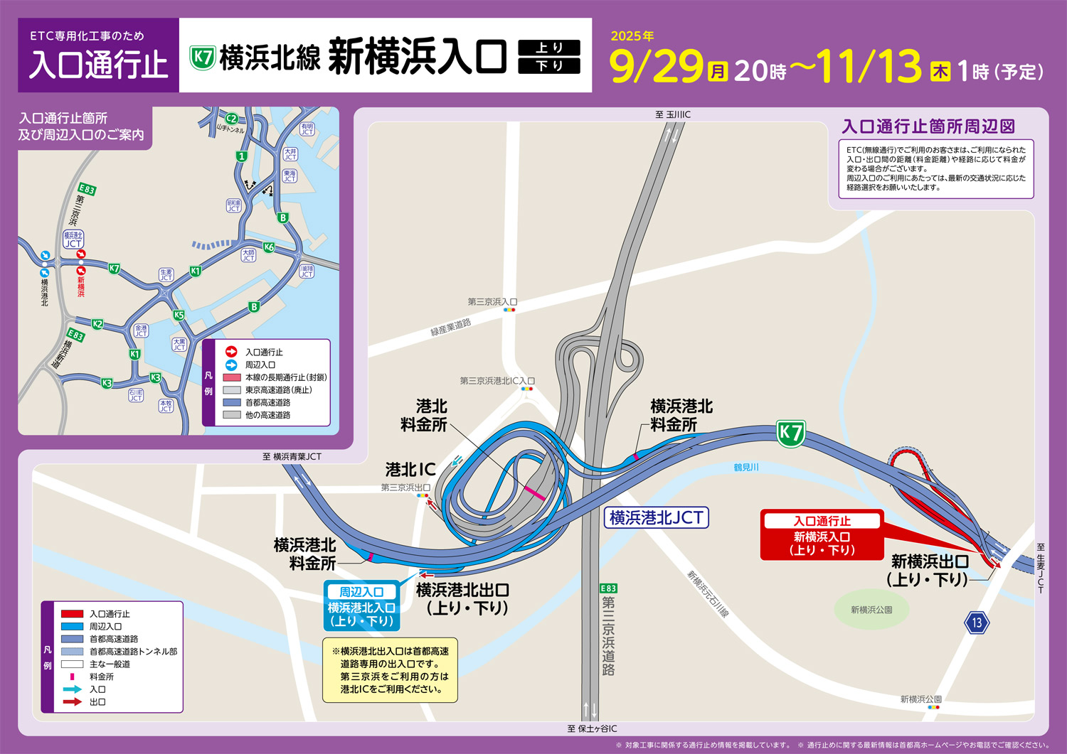 ・「7号横浜北線(上り・下り)新横浜入口における通行止めのお知らせ」(2025年9月29日20時~11月13日1時、首都高ドライバーズサイト)