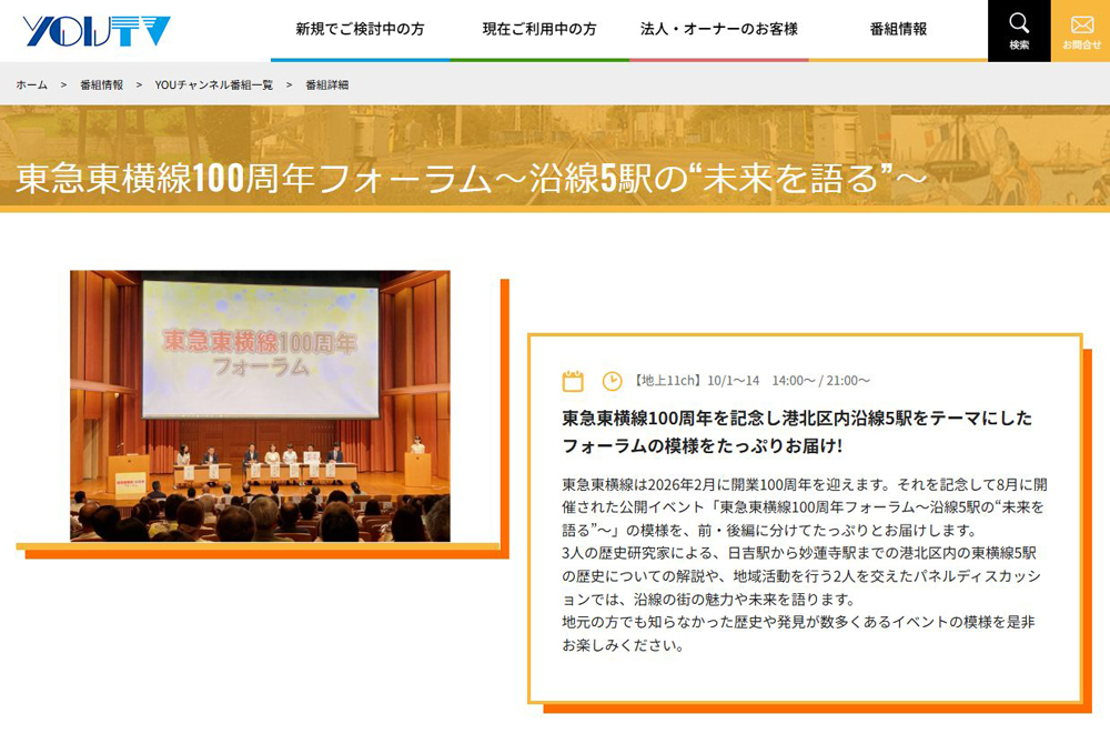 ・【メディア放映】「東急東横線100周年フォーラム」<前・後編>を特別番組としてご覧いただけます(地デジ11ch・YOUテレビ)(特設サイト)