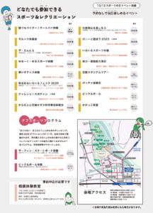 市内のプロスポーツチーム「スポーツ教室」は既に募集を締め切っていますが、イベント当日に参加できるスポーツやレクリエーション関連の体験ブース(一部は有料)も多く用意されています。