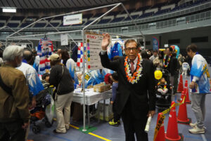 港北区商店街連合会の抽選会ブースも大盛況。綱島商店街の中森伸明会長も、同日開催の新横浜パフォーマンスで配布していた草花の首飾り「レイ(Lei)」を付けて来場