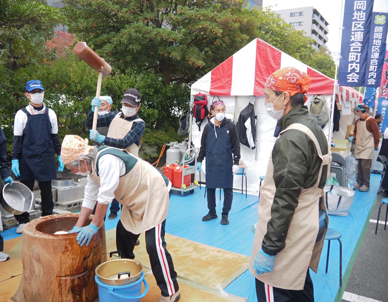 屋外コーナーも大盛況。師岡地区連合町内会はお餅つきを披露