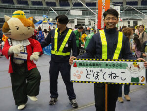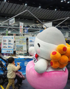 横浜市の職員が応援で出向し勤務している福島県浪江町のブースも初出展。鮭の帽子にイクラの髪の毛が特徴的な、浪江町生まれのお米の妖精「うけどん」が笑顔でまちをPR
