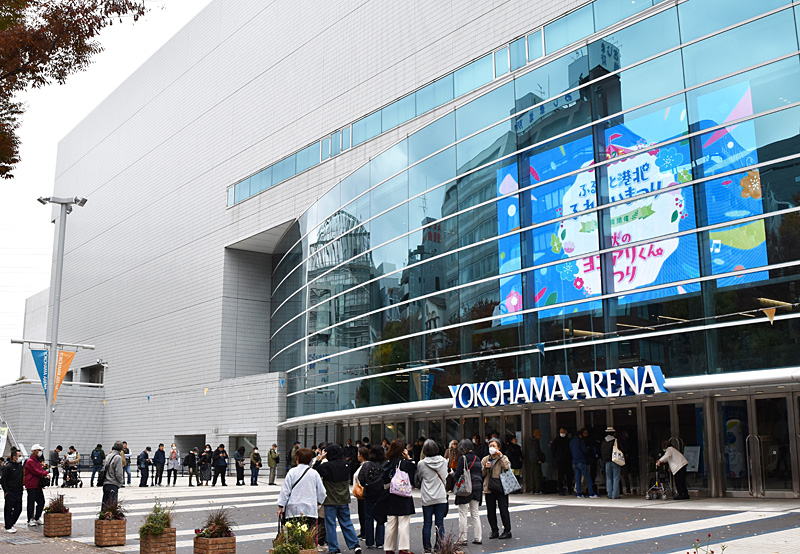 横浜アリーナの正面玄関には9時30分の開場前から長い列ができていた(11月8日)