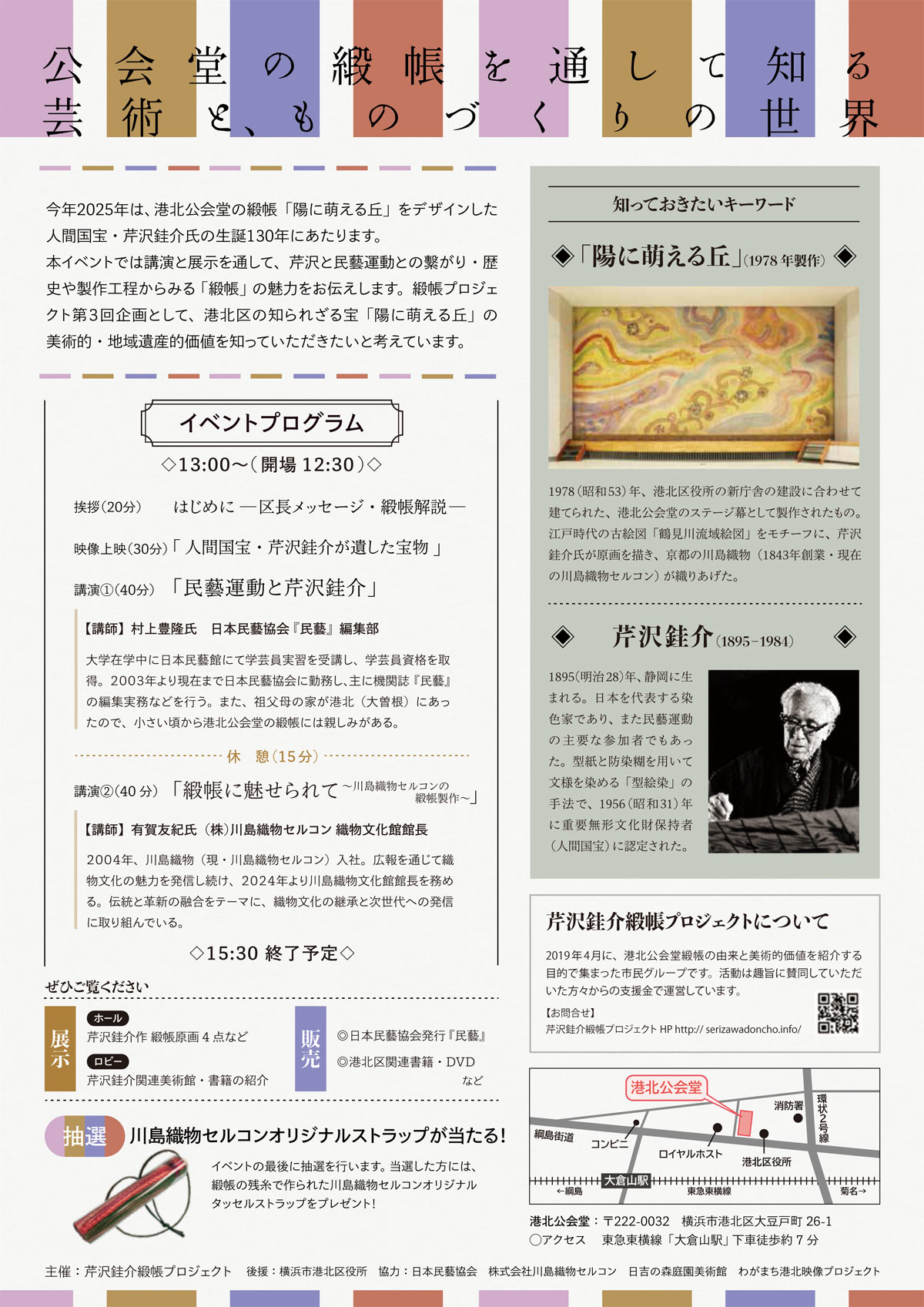 ・<港北公会堂の緞帳>人間国宝・芹沢銈介の姿勢が凝縮、背景や製作過程を解説(横浜日吉新聞、2025年11月28日、当日のレポート)※リンク追記