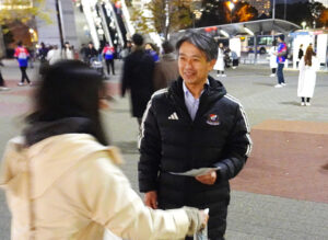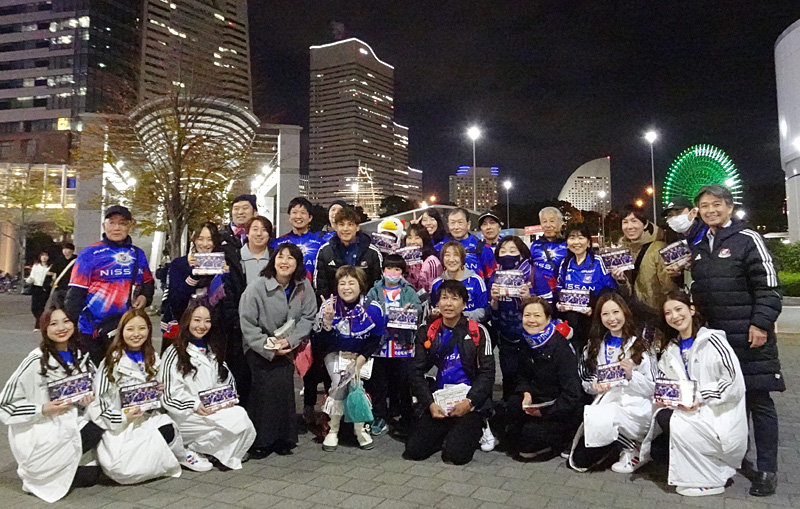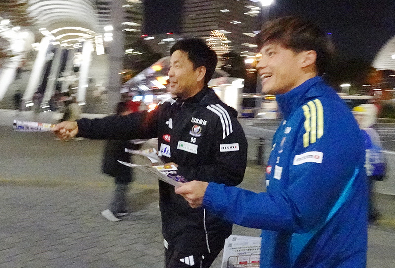 プロジェクトの初日となった11月24日(月・祝)はJR桜木町駅前に中山昭宏社長をはじめとした横浜F・マリノスの運営スタッフに加え、ボランティアのサポートスタッフ、公式チアのトリコロールマーメイズ、さらに大島秀夫監督と宮市亮選手も駆け付け、総勢約40人で最終戦を案内するチラシを配りました。