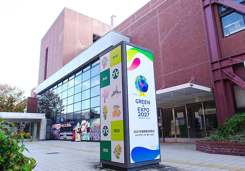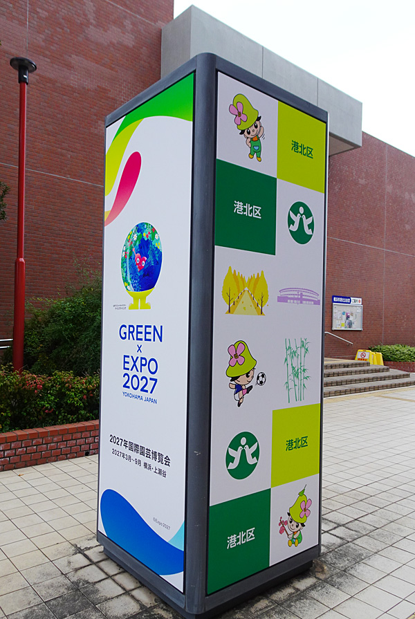 港北区は総合庁舎(大豆戸町)に設置している柱(ポール)状の細長い案内パネルのデザインを一新し、国際園芸博覧会「GREEN×EXPO(グリーンエクスポ)2027」の公式ロゴマークや港北区内の名所イラストなどに貼り換えました。