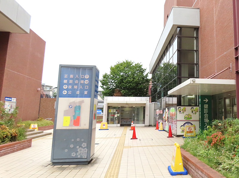 区役所の正面出入口付近に置かれた2.6メートルほどの高さを持つこの案内パネルは、健診会場や区役所、港北公会堂の出入口を矢印で示し、建物の配置図などを掲出していましたが、いずれの出入口も案内板の目の前といえる場所にあるため、迷うことはほぼありません。