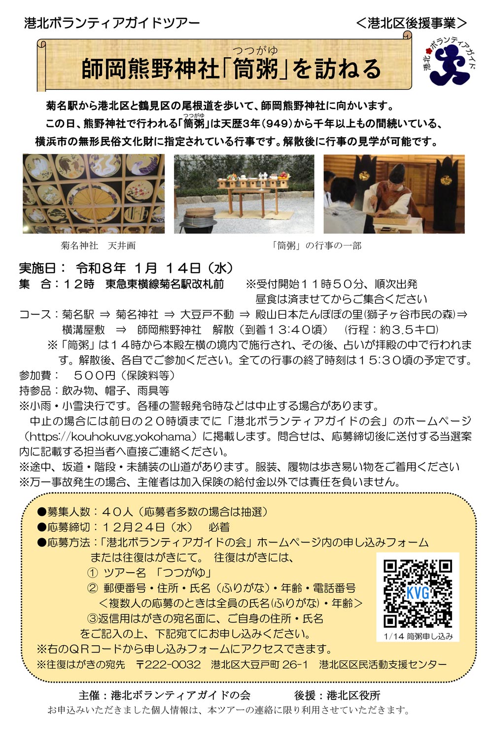 港北ボランティアガイドの会は、来年(2026年)1月14日(水)にウォーキングツアー「師岡熊野神社『筒粥』を訪ねる」を企画し、参加者40人を12月24日(水)まで募集中です。