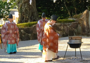 境内に据えた大釜に、玄米とヨシ(葦)の茎などを入れて粥(かゆ)を焚き、炊きあがった後にヨシの筒の中に粥がどのくらい入っているかを調べ、その年の農作物の作柄などを占うものです。