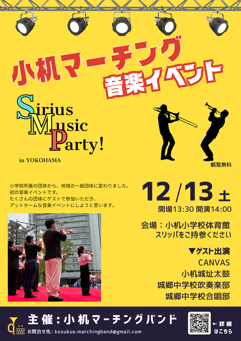 小机小学校(小机町)を拠点とし活動を行う「小机マーチングバンド」は、きょう(2025年)12月13日(土)14時から15時30分まで(13時30分開場)、「小机マーチング音楽イベント〜シリウスミュージックパーティー(Sirius Music Party!)」を、同小学校の体育館で開催します(入場無料、上履きの持参要)。
