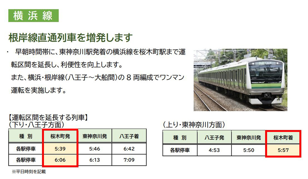 下りでは東神奈川5時46分発と6時13分発の八王子行の始発駅が桜木町に変わります。