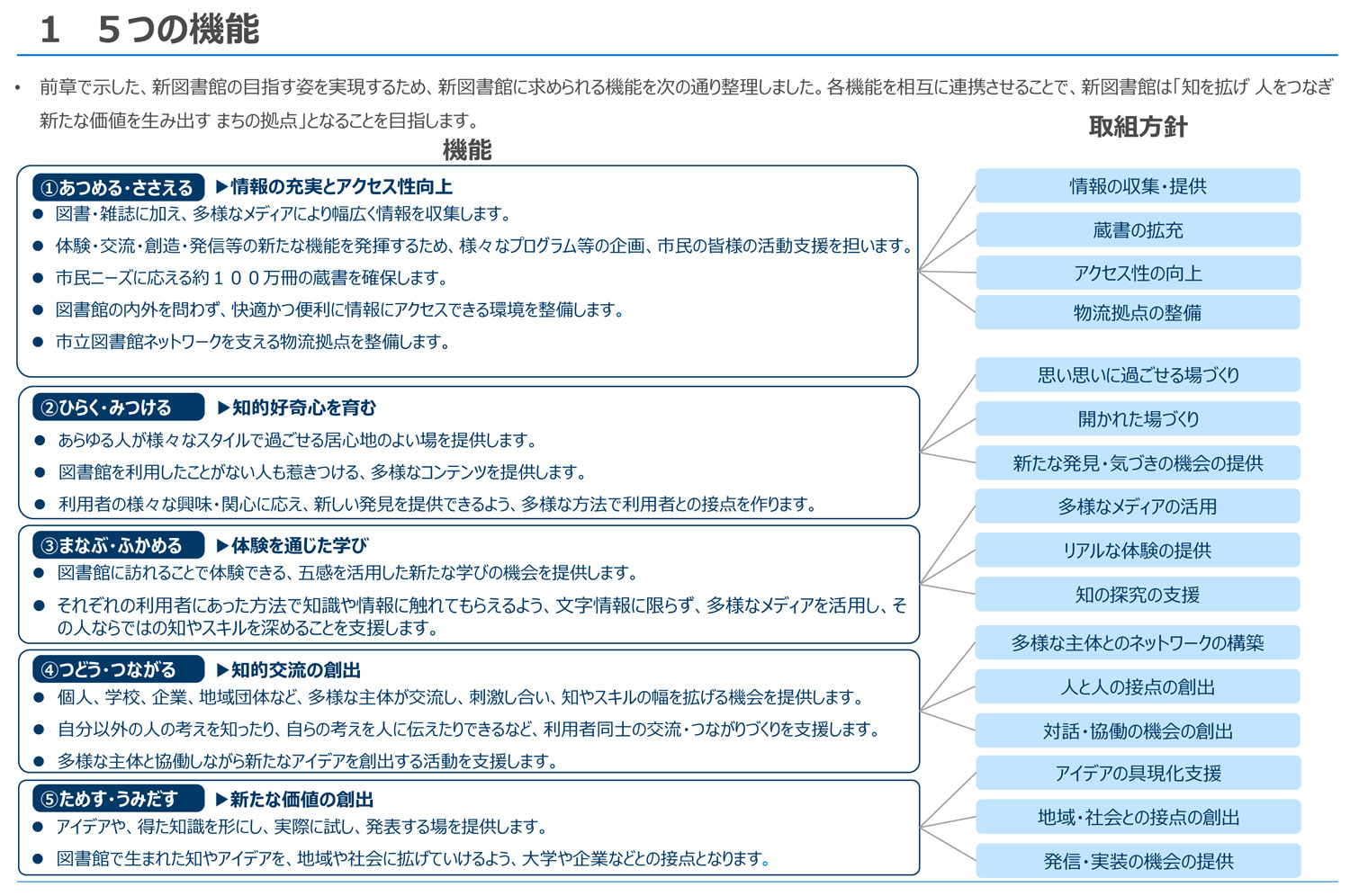 蔵書は「誰もが気軽に情報や知識に触れられることを重視するとともに、専門書まで幅広く収集し『知の創造・発信』を支えます」(基本構想素案)といい、約100万冊を収蔵する計画です。