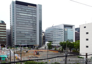 地上から見た新横浜駅前の市有地、奥にあるのは新幹線のホーム。1970年代のブーム時に高島屋がボウリング場を設け、その後は家具店として長年運営していたが、市が入手してからは仮設の建物しか建っていない。1999(平成11)年に市が策定した「新横浜都心整備基本構想」にともなって取得したと言われる。現在は新綱島の再開発にともない発生した土砂などの置場として暫定的に使用中(2025年12月)