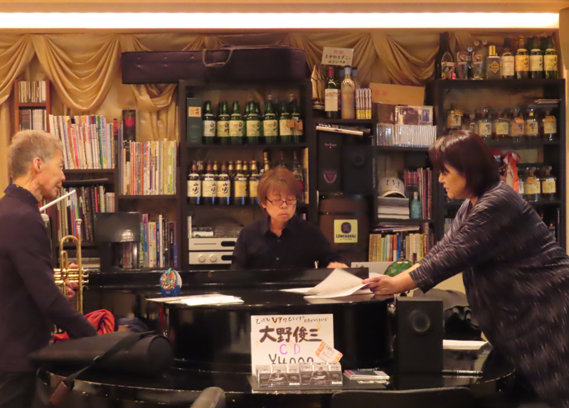 満席となった店内に訪れた人々が、同店を経営するオーナーでジャズシンガー・とがわちずこ(外川千津子)さん、ジャズピアニスト・野力(のりき)奏一さんと、大野さんのトランペットによるジャズセッションを堪能。同店の料理や飲料を楽しみながらの約1時間半のステージの時間を共有しました。