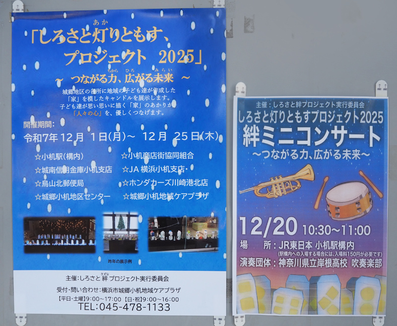 城郷地区(小机町・鳥山町・岸根町)に住まう人々の「絆(きずな)」を育むこと、また「共に元気になろう」との目標を設定し事業を展開しているしろさと絆プロジェクト実行委員会(事務局:城郷小机地域ケアプラザ、小机町)は、あす(2025年)12月20日(土)10時30分から11時まで、「しろさと灯りともすプロジェクト2025絆ミニコンサート」をJR小机駅構内(改札内有料スペース)のコンコースで初めて開催します。