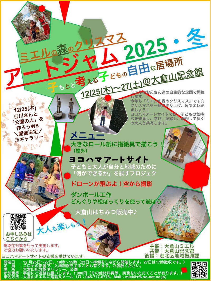 大倉山地区で恒例となった「ミエルの森のクリスマス~アートジャム2025・冬」イベントが、(2024年)12月25日(木)から27日(土)までの10時から15時まで、大倉山記念館(大倉山2)内のギャラリーと、大倉山公園(同)で開催されます。