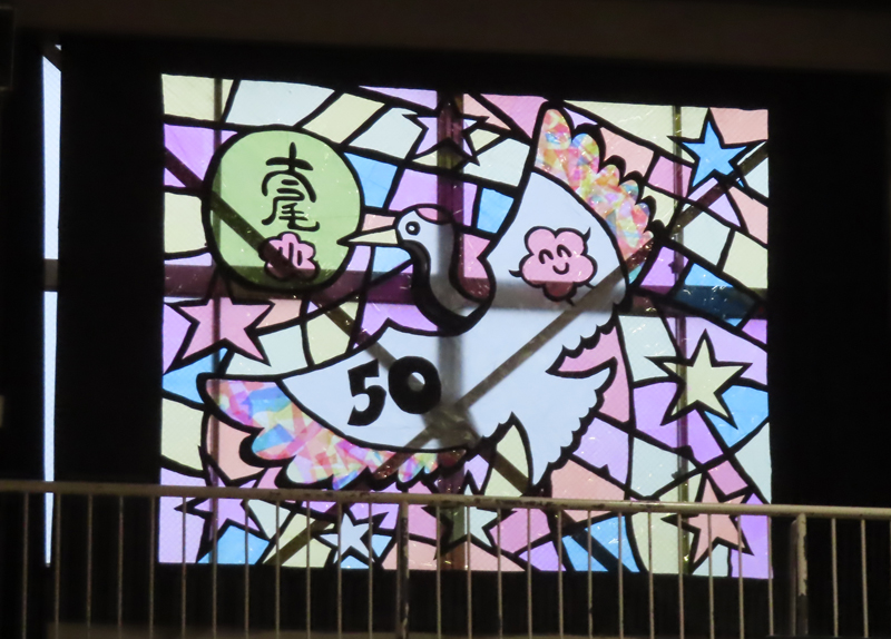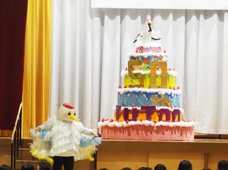全校児童186作品の応募作品の中から選ばれた50周年記念キャラクター「フラッピー」が登場、「ハッピーバースデー」の歌を歌っての巨大バースデーケーキや、体育館のステージに向かって左側の窓ガラスを全面に使用した「ステンドグラス」風の巨大アート装飾が登場、会場が大きな歓声で包まれます。