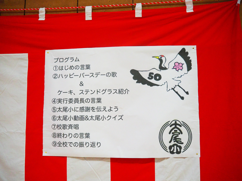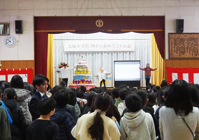続いて体育館に児童が集い、児童の実行委員会が企画したプログラムでの「太尾小学校50歳おめでとうの会」を開催。