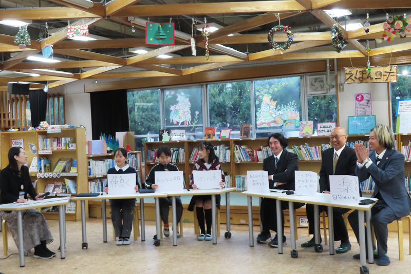 実行委員会を務めた4年生から6年生の各学年代表の3人の児童と館雅之校長、地域代表として実行委員会の竹﨑理浩会長(学校運営協議会会長・大倉山地区連合町会・太尾親和町会会長)、保護者代表として、前PTA会長の波多野大実行委員長が登場し、「太尾の地域、歴史、未来」をテーマに、それぞれの想いをパネルに記し語り合う時間を共有しました。