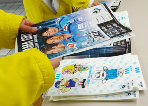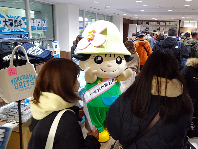 2日の初戦は、昨シーズンに続く港北区民DAYとして、ホッケー体験ツアーを含め区民65組130人を昨年11月の「広報よこはま港北区版」などで公募招待するとともに、試合当日は会場で港北区ミズキーが来場者を出迎え、ピリオド間には氷上で“シュートチャレンジ”に登場するなどして盛り上げました。