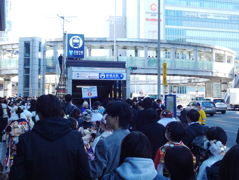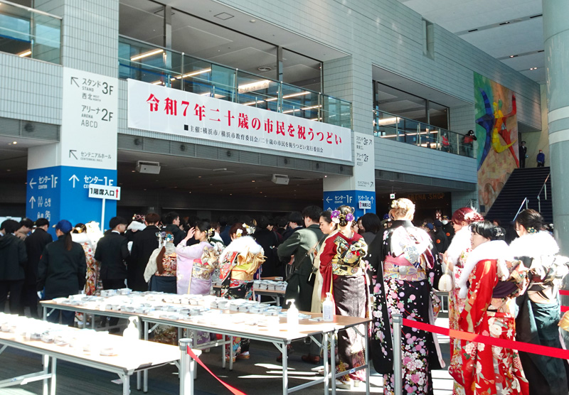 旧成人式の時代から全国最大規模の式典とされており、当日は着付けを行うホテルをはじめとして新横浜の街が大混雑します。会場周辺は交通規制と入場規制が行われ、参加対象者以外は横浜アリーナの玄関前へ近づくことができなくなります。