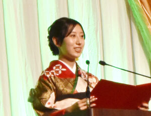 午後の部では大学生の是澤(これさわ)萌愛(もえ)さんが「自分の背中を押してくれる人の存在が私の一歩を支え、今の私へと成長させてくれました。支えてくれた全ての方への感謝の気持ちを忘れず、人とのつながりを大切にしながら、夢や目標に向かって一歩ずつ前進していきたい」との思いを述べました。