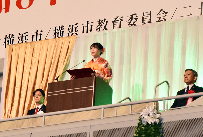 参加した20歳の市民による「二十歳の誓い」は、午前の部に大学生の田中穂乃花(ほのか)さんが立ち「二十という節目は、私にとって人生の新章の始まり。これからは自らの挑戦を続けるためだけではなく、これまでいただいた恩を少しずつ周りに還元し、誰かの力になれる大人を目指して歩んでまいります」と宣言。
