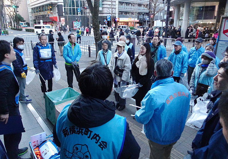 また、今年も式典終了後には地元の新横浜町内会が中心となった清掃活動が会場周辺で行われ、8人の20歳市民が加わり、株式会社横浜アリーナの社員も駆け付けて総勢50人近くでアリーナ通りやいちょう通りなどに落ちていたごみを拾いました。